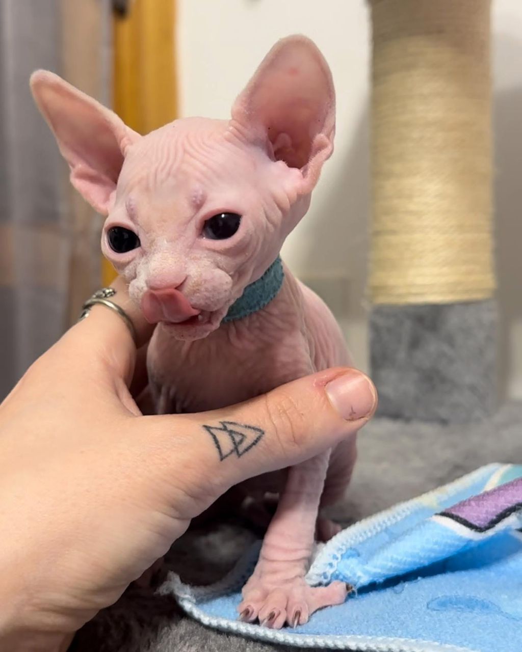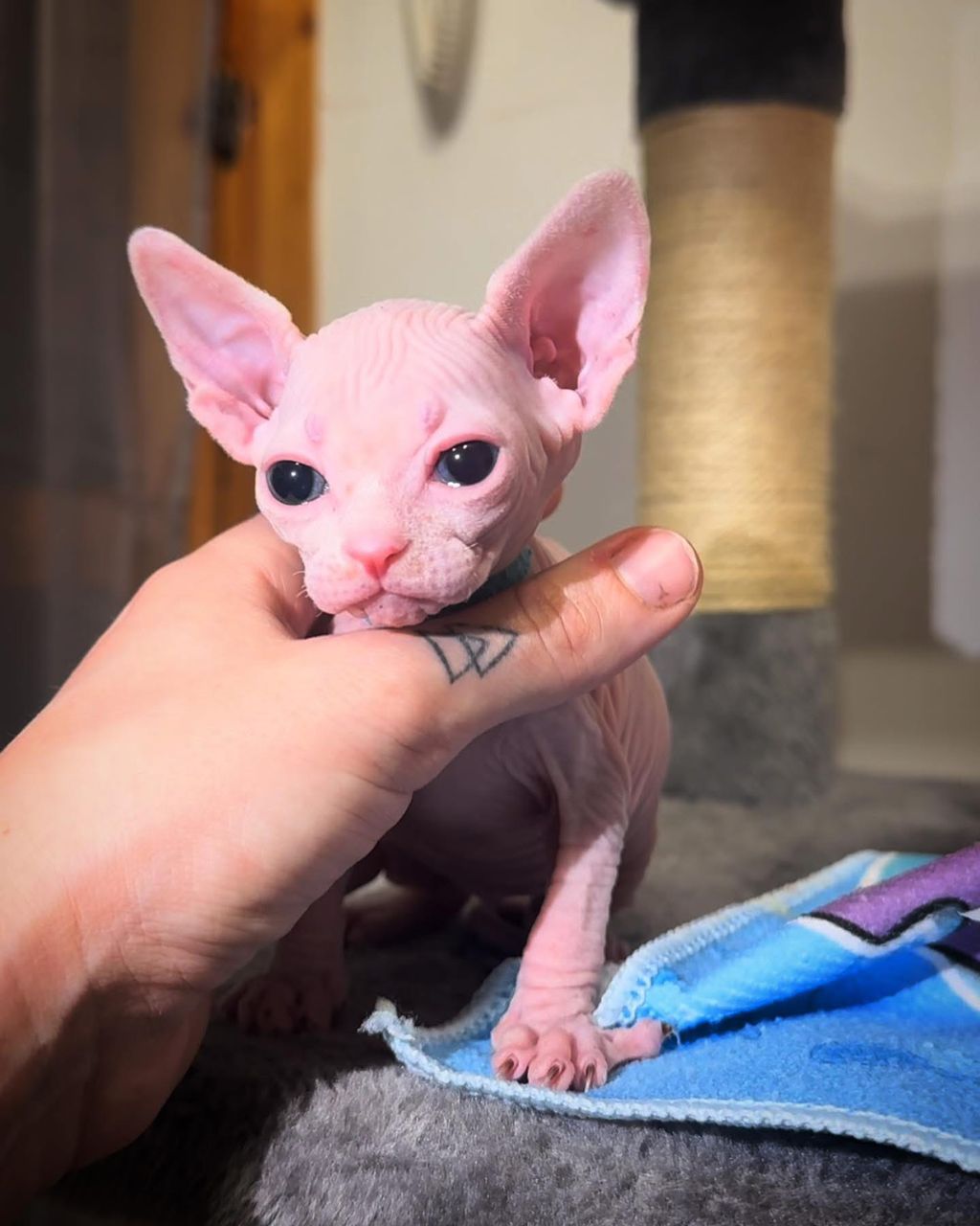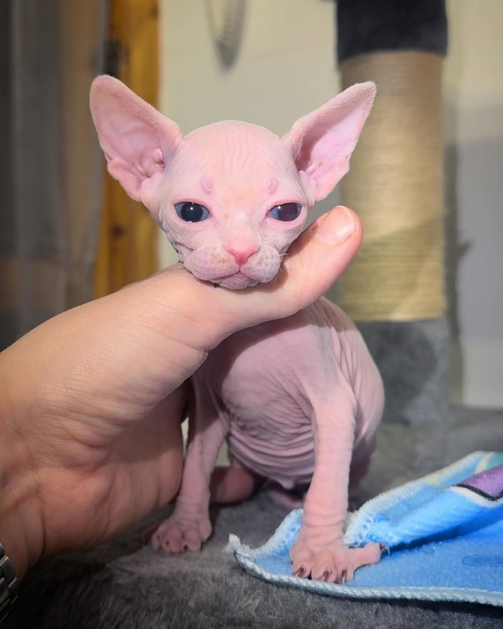 Sphynx cats are known for their hairless appearance, large ears, and distinctive wrinkles, but the white Sphynx kitten stands out even more with her bright, elegant skin tone. Beyond her looks, she’s: